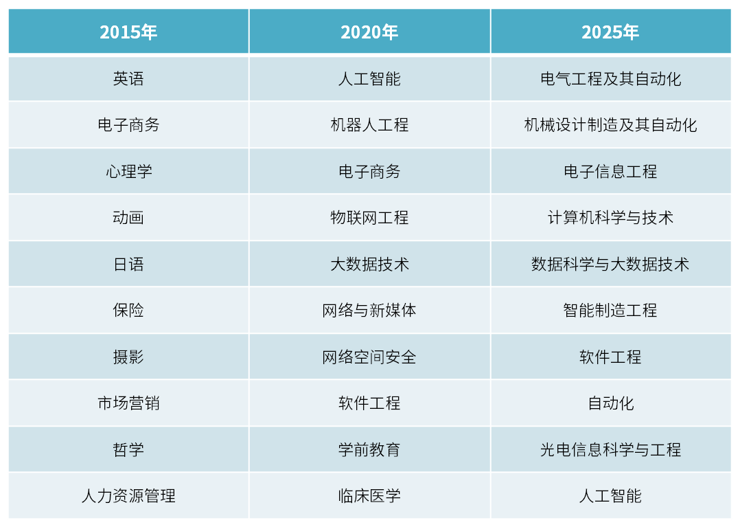 按照麦可思研究院的数据来看,近十年间的绿牌专业(绿牌指的是就业对劲度高的需求增加型专业)根基均为工科专业,但具体的专业标的目的有些微妙的变化。好比,正在2015年、2020年均上榜的软件工程、收集工程消逝正在本年的榜单上;电气工程及其从动化正在2015年未上榜,但正在近五年却连结着不错的位次。