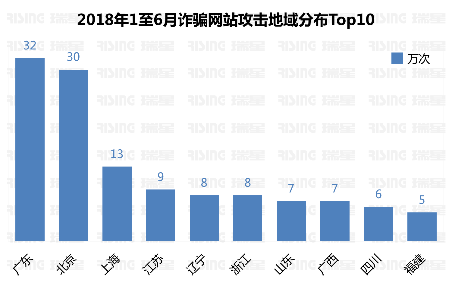 2018年上半年瑞星“云平安”系统共拦截诈骗网坐182万余次,广东受诈骗网坐32万次,位列第一位,其次是市受诈骗网坐30万次,第三名是上海市受诈骗网坐13万次。