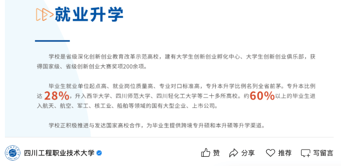 四川工程职业手艺大学亦是如斯,学校最新发布的就业数据显示,结业生有60%以上都能进入航空航天、军工、核工业、船舶等范畴的国有大型企业和上市公司就业!