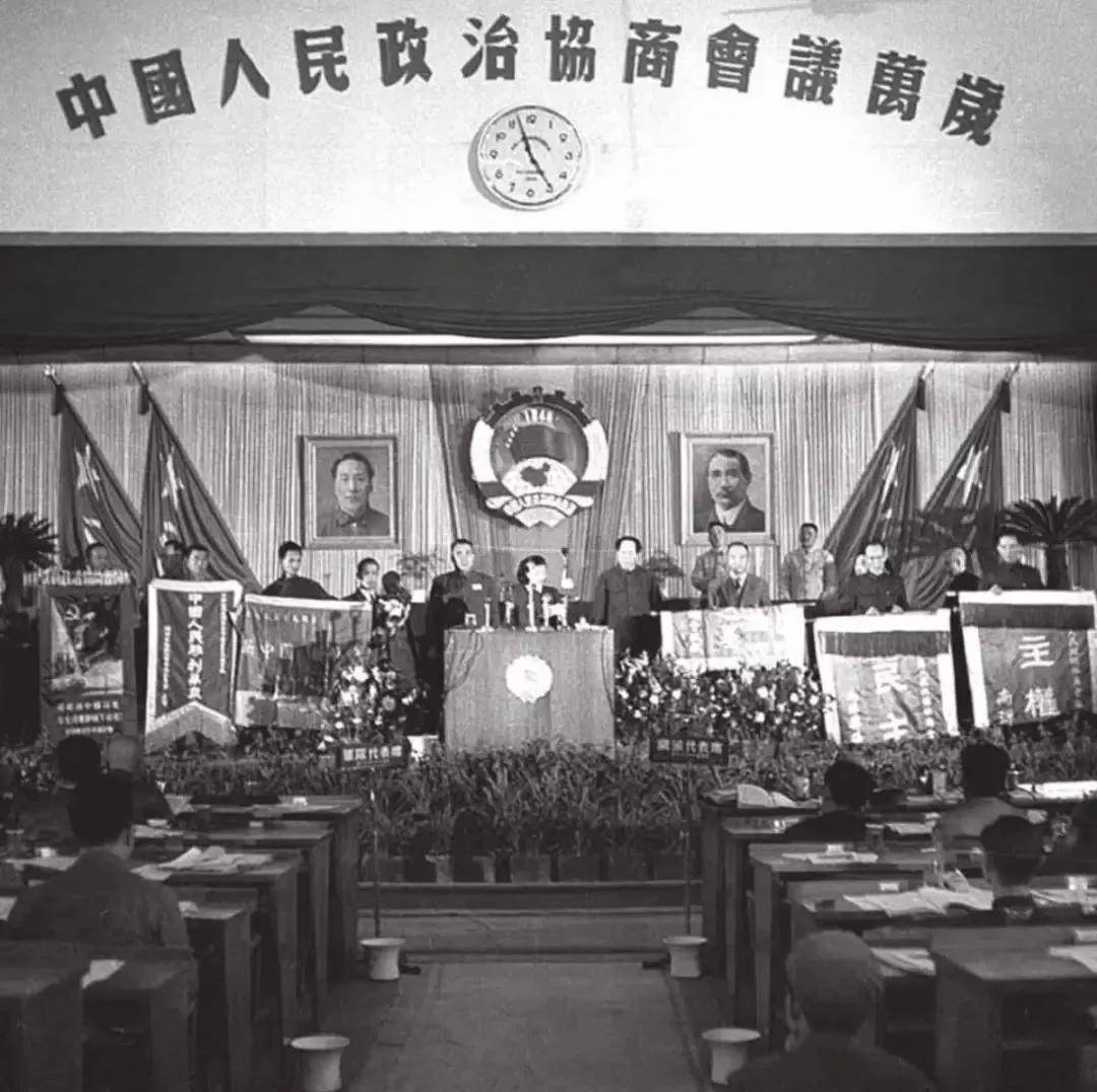 新政协筹备会议期间,毛取中国侨联第一任陈嘉庚(左一)、副庄(前左一)正在勤政殿前合影。毛正在新政协筹备会第一次全体味议上颁发讲线时,中国人平易近协商会议第一届全体味议正在怀仁堂举行。会议代表630多人,宾客300人。