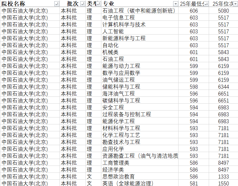 :物理类的石油工程、油气储运工程、资本勘查工程、计较机科学取手艺,汗青类的能源经济、会计学、,2025年物理类通俗类最低586分、部门抢手专业593分,汗青类通俗类最低581分、抢手专业586分即可报考,适配中高分段考生;克拉玛依校区分数相对较低,可做为平分段考生的高性价比选择。